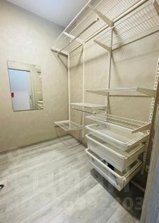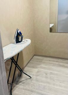 Гардеробная площадью 5,5 кв.м. с модульной системой хранения, гладильной доской, утюгом, напольной сушилкой, пылесосом и большим зеркалом.
