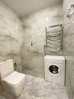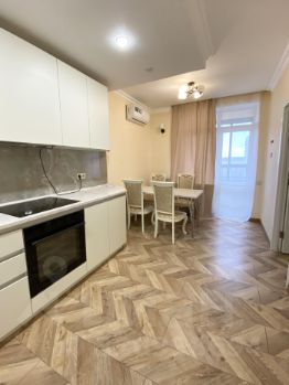 Кухня со встроенной техникой, есть микроволновая печь. Кондиционер. Всё, как на фото. Возможна покупка посудомоечной машины. Санузел в плитке. Полы с подогревом.