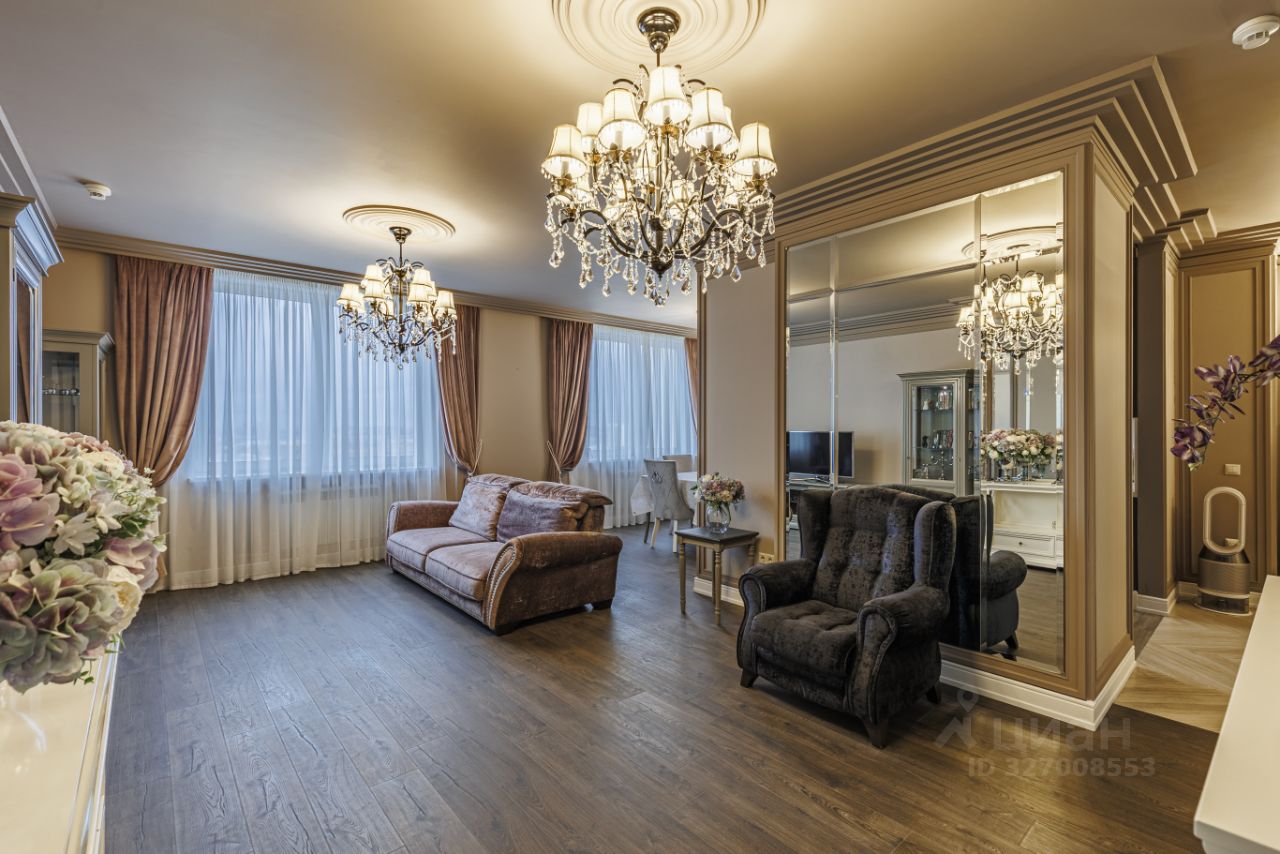Интерьер выполнен в элегантной классике: много света, молдинги, качественная столярка, натуральный паркет, дизайнерские люстры.