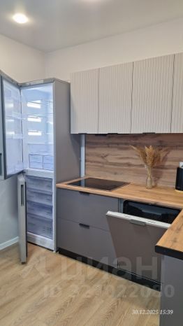 Просторная и светлая кухня-гостинная оснащена всей необходимой мебелью и техникой: есть холодильник и посудомоечная машина.