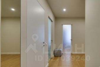 В квартире два совмещенных санузла. Один санузел с ванной, стиральной машиной и раковиной с зеркальной подсветкой, другой санузел-гостевой, с раковиной и туалетом. В прихожей разместили настенную вешалку с крючками, а также мягкий пуф.