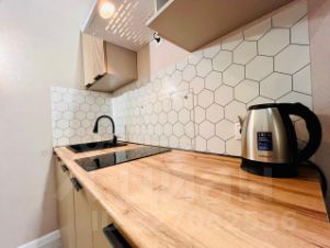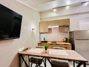 Кухня оборудована всем необходимым: холодильник, плита, варочная панель, микроволновая печь и чайник. Из мебели — вместительные шкафы и обеденный стол с барными стульями. В комнате установлен телевизор и кондиционер.