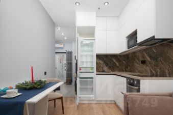 - Функциональная кухня-гостиная: современный кухонный гарнитур с встроенной техникой (холодильник, духовой шкаф, микроволновка, варочная панель, посудомоечная машина) и удобная зона отдыха с диваном и стильным декором.