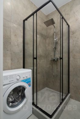 • Ванная комната с ванной, стиральной машиной и современной сантехникой.