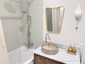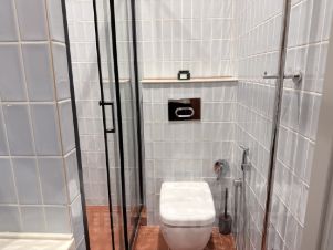 Здесь есть все необходимое для комфортного проживания: современная мебель на кухне и в комнатах, а также полный комплект техники — кондиционер, холодильник, посудомоечная машина, телевизор, кулер и стиральная машина. Для вашего удобства в квартире два совмещенных санузла, а также ванна и душевая кабина.