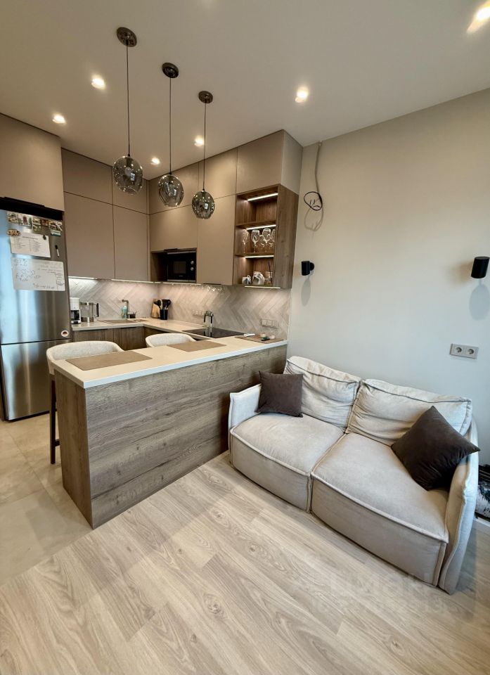 Кухня-гостиная: полностью оборудованная кухня с техникой Bosch (холодильник, посудомоечная машина, плита), вместительный кухонный гарнитур, диван, телевизор. Подоконник с местом для сиденья.