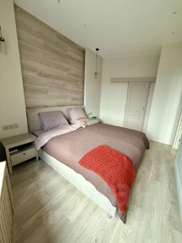 Спальня: двуспальная кровать 180 см, подоконник с местом для сидения, телевизор и вместительная оборудованная гардеробная.