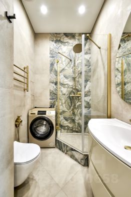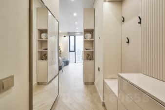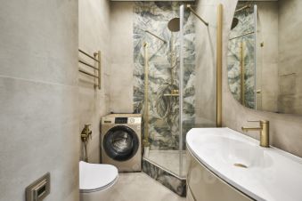 Квартира оборудована встроенной бытовой техникой: варочная панель, вытяжка, духовой шкаф, микроволновая печь, холодильник, стиральная и сушильная машины, телевизор. Установлен кондиционер.