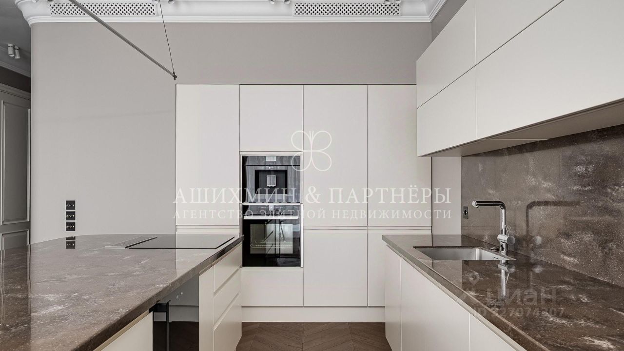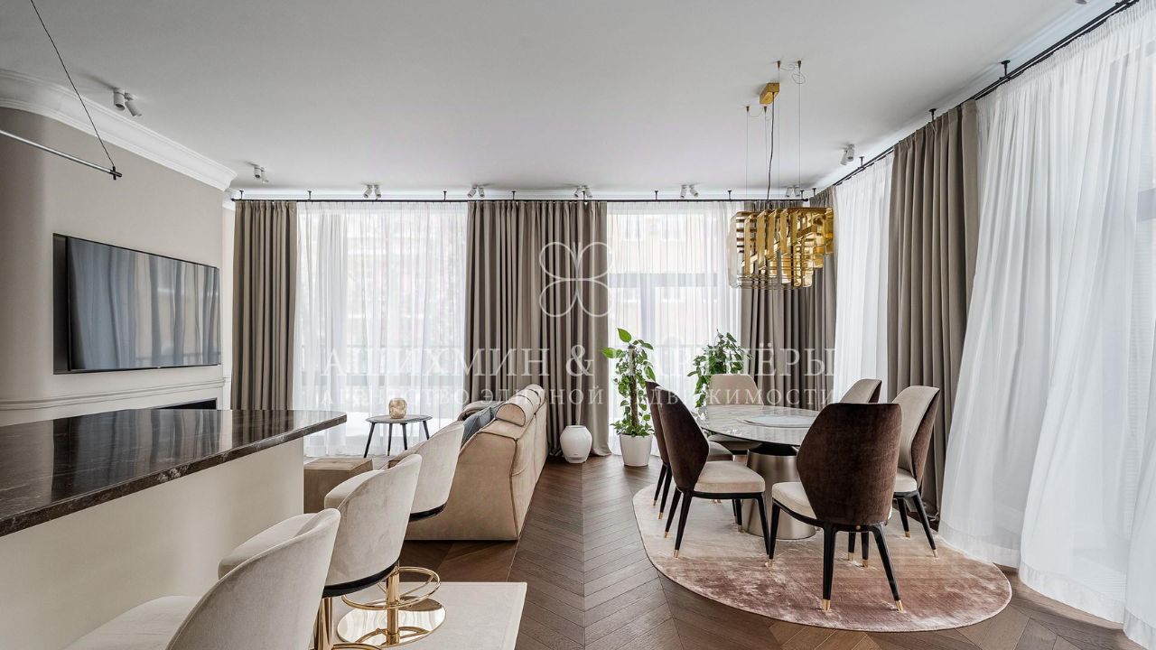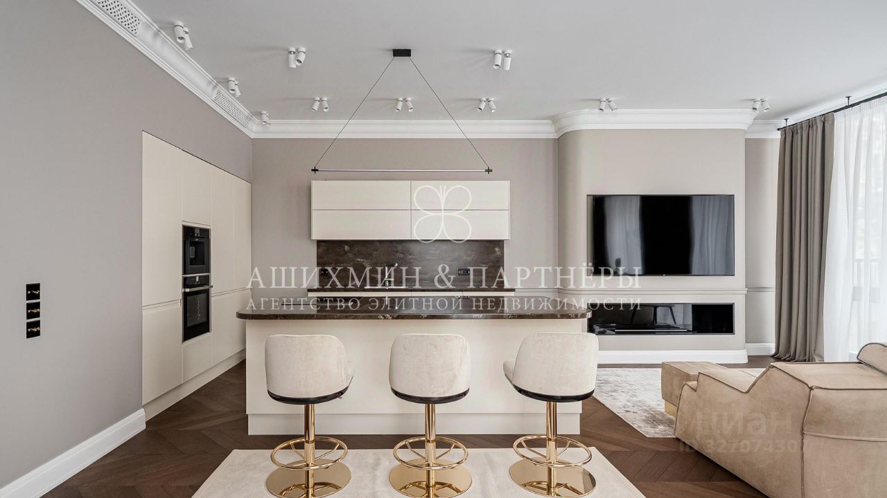 В квартире выполнен авторский дизайн с дорогой отделкой и мебелью: натуральное дерево, мрамор, бытовая техника Smeg и Neff, тщательно подобраны декор и искусство.