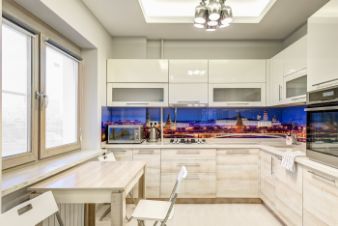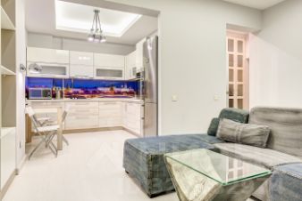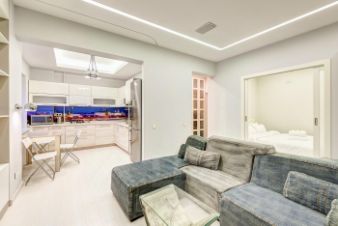 В квартире для удобного проживания имеется современная мебель: двуспальная кровать, диван, бытовая техника, скоростной WI-FI, спутниковое ТВ, гладильная доска, сушка, оборудованная кухня, полный комплект посуды для приготовления и приёма еды, фен