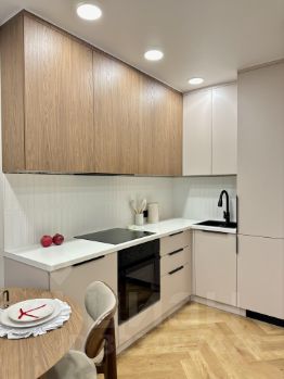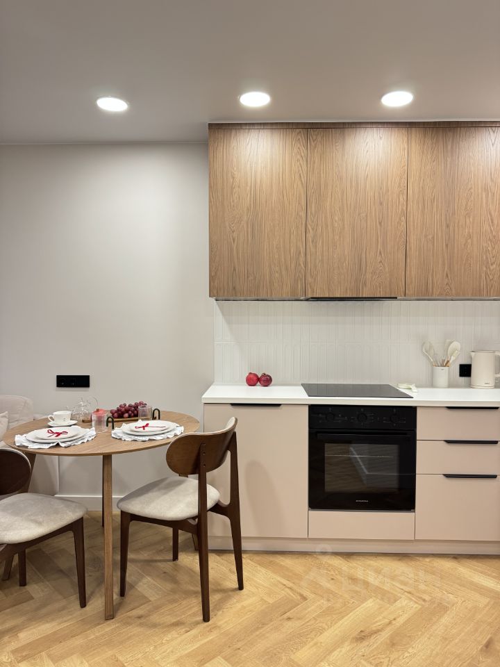 Электрика и розетки расположены удобно и продуманно. Кухня функциональная и красивая, выполнена на заказ, с хорошими системами хранения и встроенной техникой. Есть полный комплект посуды и приборов, поэтому можно просто заехать и готовить свои первые завтраки в новой квартире.