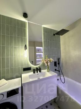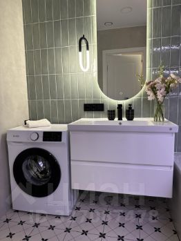 Полноценная ванна, удобный комод, стиральная машина, стильные аксессуары и декор. Пространство, где приятно начинать и заканчивать день.