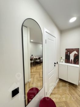 В прихожей установлен вместительный шкаф с антресолью, есть стильный пуф и зеркало в полный рост.