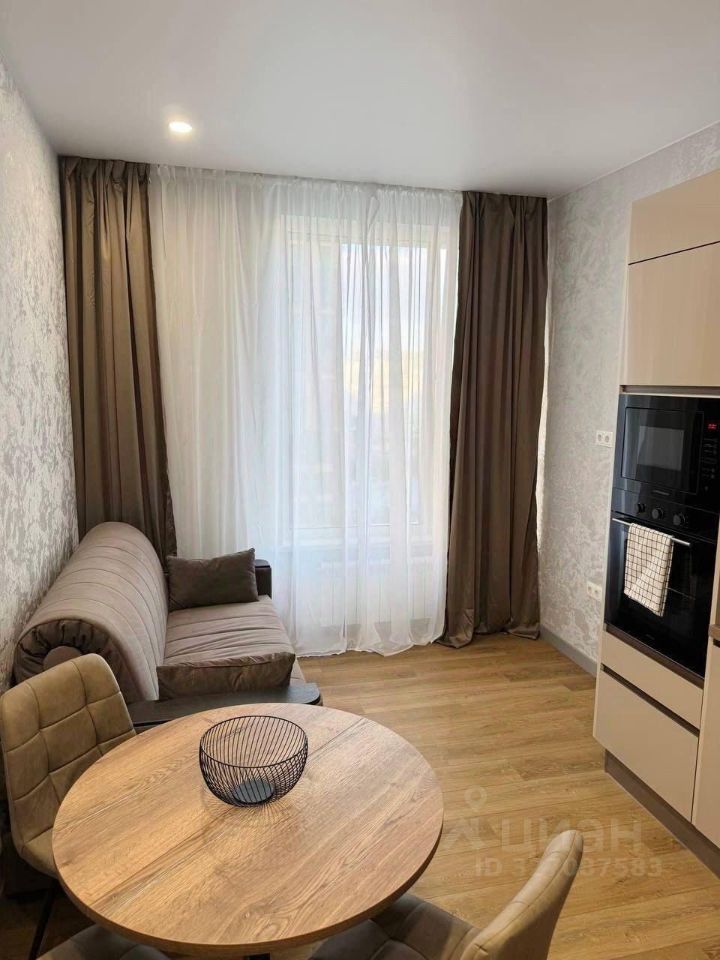 Кухня-гостиная со встроенной бытовой техникой: посудомоечная машина, духовой шкаф, варочная поверхность, микроволновка; раздвижной диван и стол.