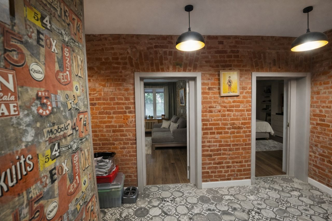 Авторский интерьер с кирпичной кладкой и дизайнерскими акцентами