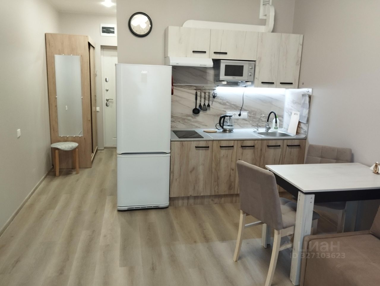 Сдается современная студия в новом монолитном доме, расположенном в 10 минутах пешком от метро Прокшино. Квартира находится на 11 этаже 17-этажного здания, построенного в 2022 году. Общая площадь — 24 кв. м, жилая — 20 кв. м, кухня — 4 кв. м. Высота потолков — 2.84 метра.
