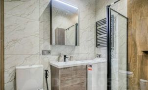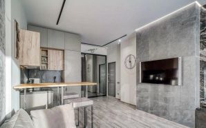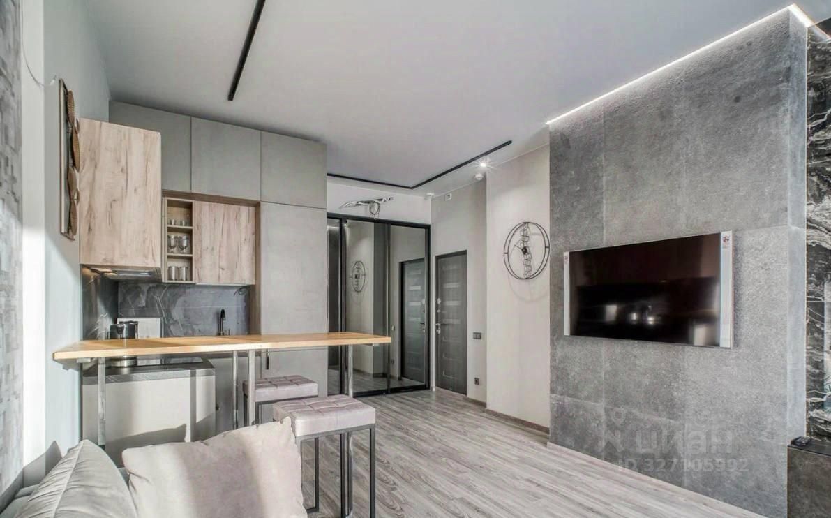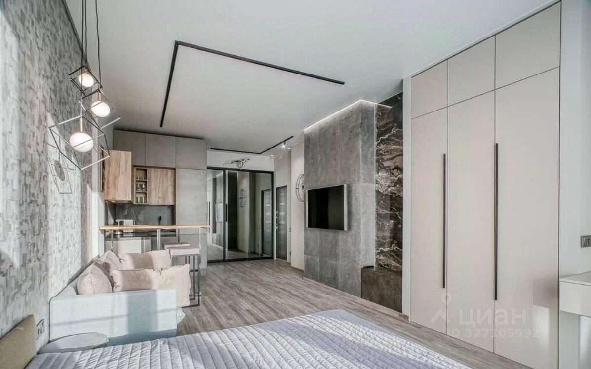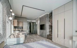 Студия с дизайнерским ремонтом полностью готова к проживанию. В комнате и на кухне есть вся необходимая мебель, а также современная бытовая техника: кондиционер, холодильник, посудомоечная машина, телевизор и стиральная машина. В объединённом санузле установлена душевая кабина. Окна выходят во двор, поэтому в квартире всегда тихо и спокойно.