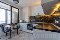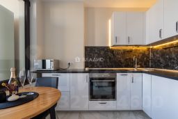 спальня с двуспальной кроватью (с выдвижными коробами для хранения) и прикроватными тумбами, рабочее место, lounge-зона с TV-панелью, шкаф-купе для хранения вещей; изолированная кухня, c обеденной группой у выхода на лоджию с панорамными окнами, оснащена холодильником, варочной панелью, духовым шкафом, СВЧ-печью, стиральной машиной; санузел с ванной - совмещён, оборудован полками, зеркалом и тумбой с выдвижными ящиками;