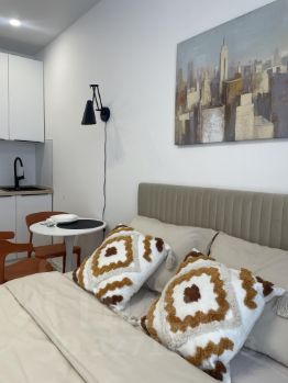 Спальня зона: шикарная уютная двуспальная кровать с ортопедическим матрасом и подъемным механизмом, шкаф для одежды, просторное рабочее место, большой телевизор, шторы блэкаут.