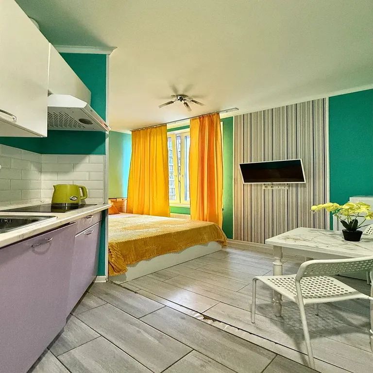 Студия полностью оборудована для комфортного проживания: телевизор, бесплатный wi-fi, стиральная машина, утюг, фен, варочная панель, чайник и микроволновка. Есть штопор и бокалы. Регулярная уборка профессиональной химией и дезинфекция от насекомых, а также смена белья на чистое и свежее проводятся перед каждым заездом.