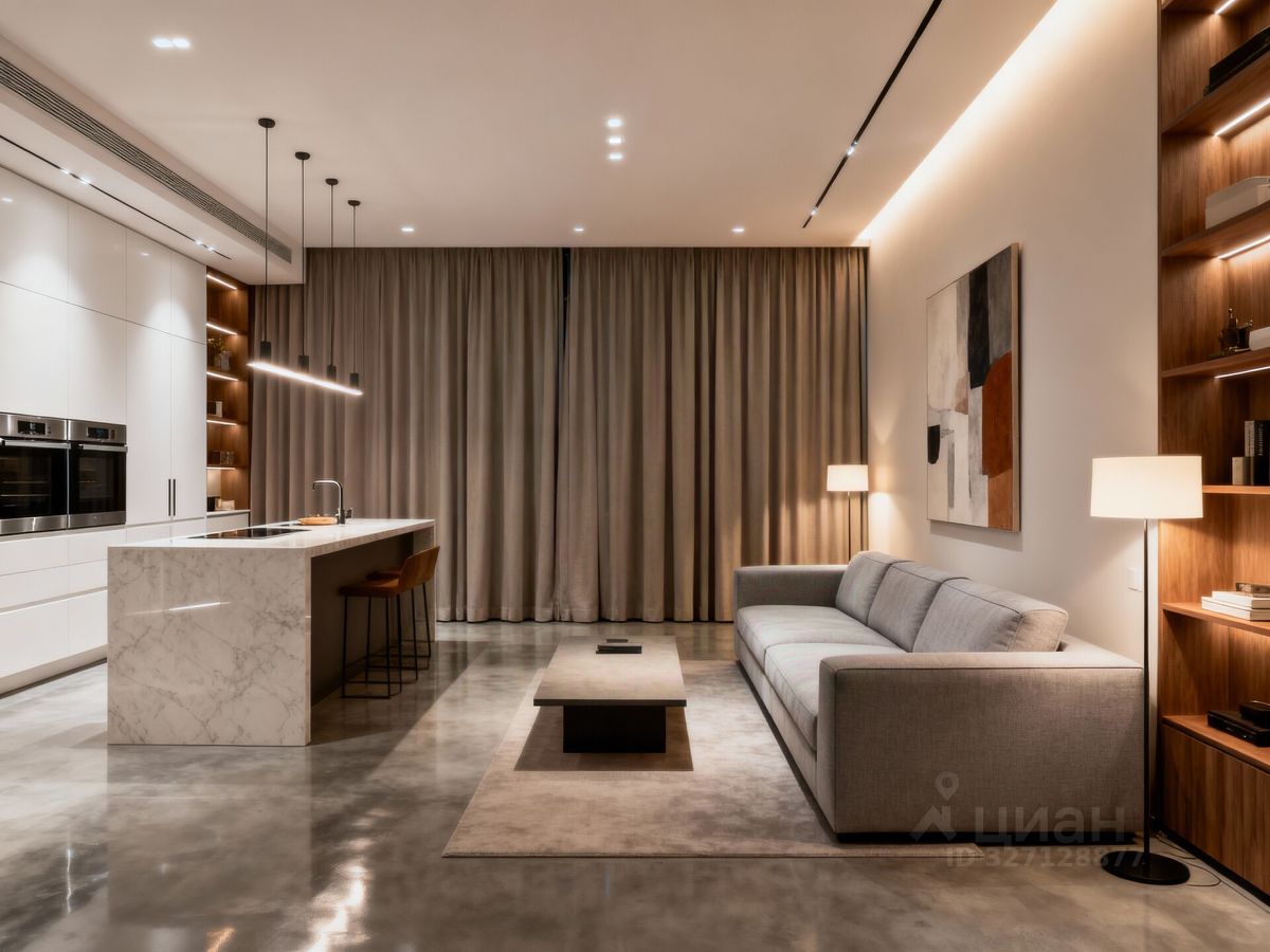 Просторная кухня-гостиная открытой планировки.