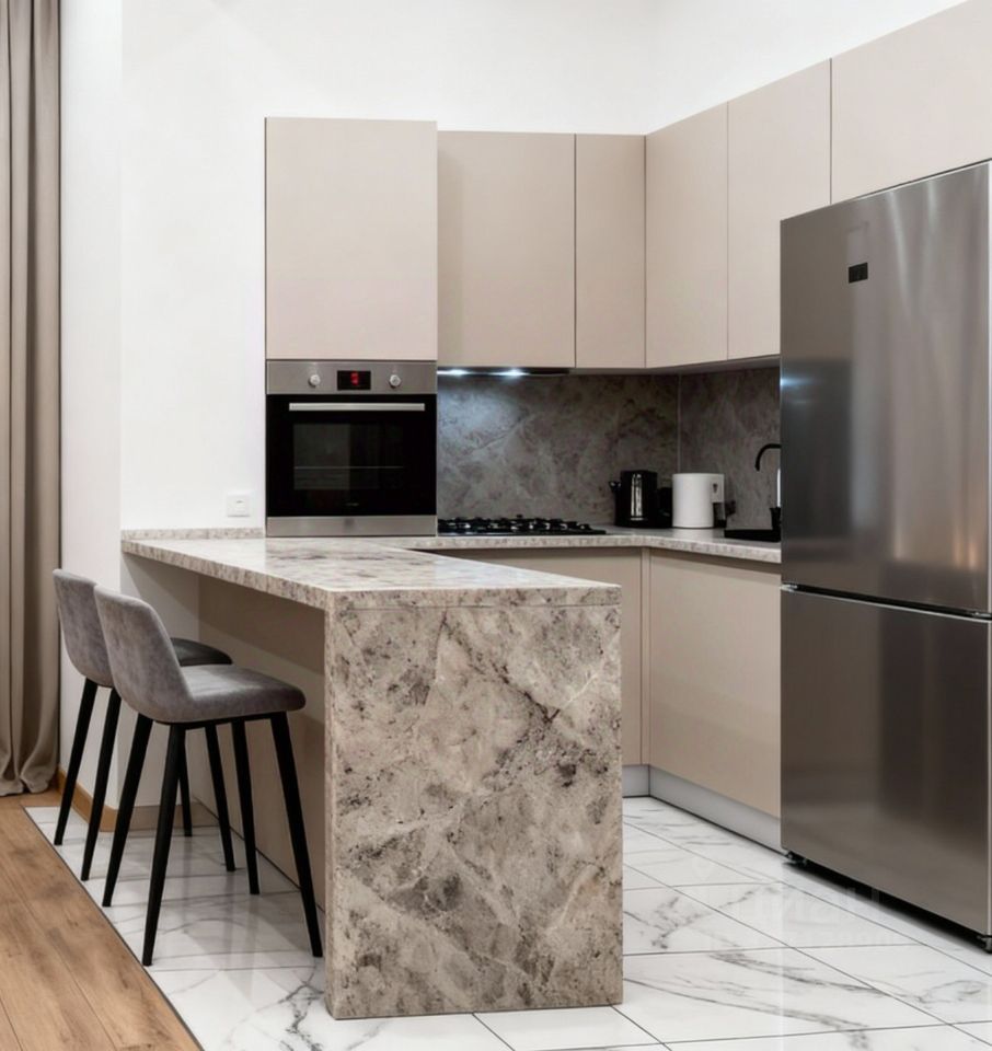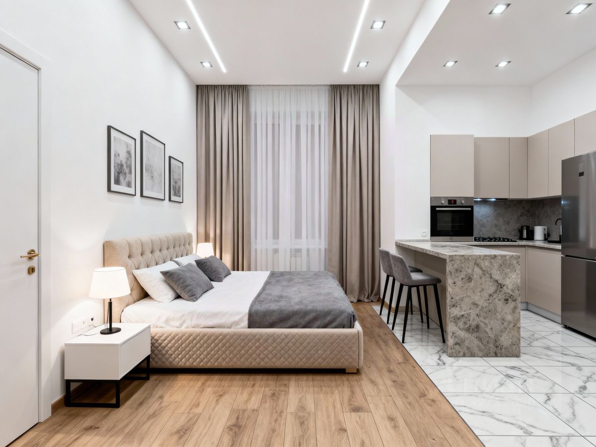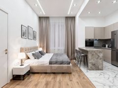 Функциональная кухня, дизайнерские решения и продуманное освещение делают студию идеальной для тех, кто ценит эстетичные детали и современный комфорт.