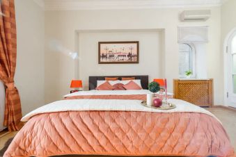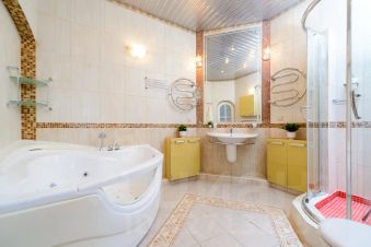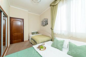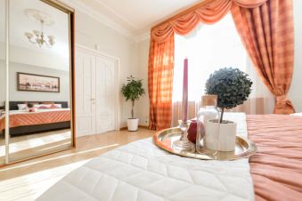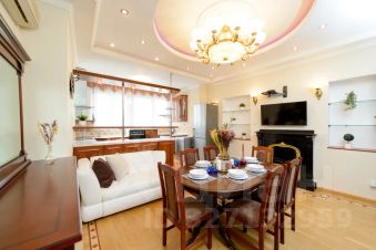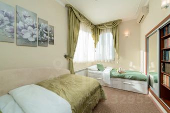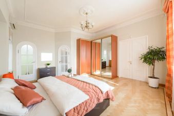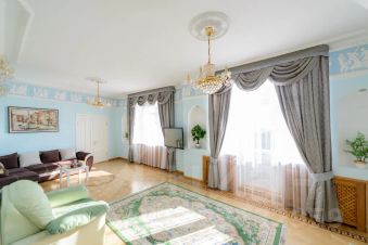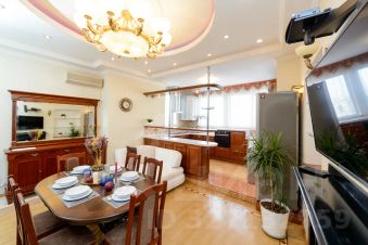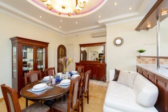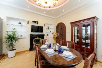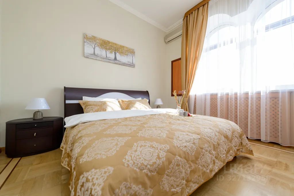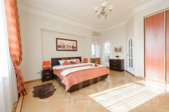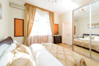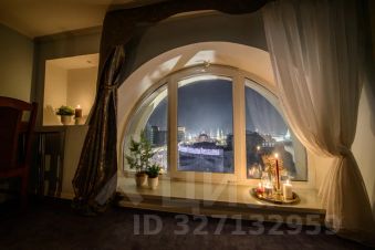 Роскошный двухуровневый пятикомнатный пентхауз площадью 190 квадратных метров на верхнем этаже высотного дома в 2-х минутах пешего шага от красной площади и с видом на кремль. На нижнем уровне расположены гостиная, три спальных комнаты, кухня-столовая и два полноценный санузла с ванной, туалетом и душевой кабиной, а также, гостевой туалет. На верхнем уровне - одна романтичная спальная комната. В просторной гостиной имеется два дивана, один из которых раскладной двуспальный. Также, в гостиной имеется большой телевизор и балкон с видом на красную площадь и кремль. Мастер-спальня на нижнем уровне оборудована большой кроватью 2x1, 8м, шкафом купе и имеет выход в собственную ванную комнату. Мастер-спальня, также, обращена окнами на кремль. Вторая спальная комната содержит большую двуспальную кровать 2x1, 8м с подсветкой, шкафе-купе и вид на кремлевские башни. Третья спальная комната оборудована двумя удобными односпальными кроватями каждая размером 2x0, 8м. Одна из кроватей раскладная и может превращаться в двуспальную шириной 2x1, 6м. Окна этой спальни выходят во двор. Столовая оборудована кухонной зоной, содержащей все необходимое кухонное оборудование - плиту, духовой шкаф, микроволновую печь, посудомоечную машину, холодильник. Также, в столовой имеются большой обеденный стол, диван, комод с зеркалом, сервант, телевизор и декоративный камин. Самое романтичное место в квартире - это уютная спальня на втором уровне. Окно в пол позволяет любоваться панорамой кремля не вставая с кровати. Особенно красив вид на огни кремля в ночное время. В квартире установлены звукоизолирующие окна повышенной толщины, поэтому в комнатах очень тихо. Все спальни оборудованы кондиционерами. Великолепный вид, роскошный ремонт и классический стиль в оформлении интерьера создают ощущение роскоши и комфорта, а также, уютное и радостное настроение.