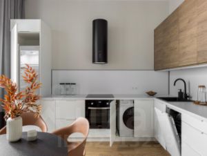 Кухня отдельная от остальных комнат. Вытяжка, посудомоечная машина (стиральная тоже здесь), плита, духовка, холодильник. Два кондиционера. Обеденный стол и много мест для хранения продуктов и другого кухонного стаффа.