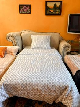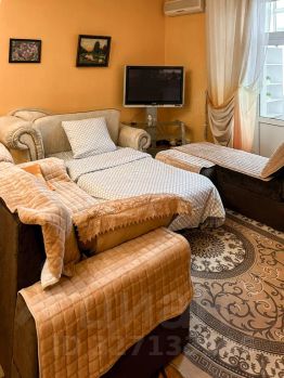 Просторная гостиная совмещена с кухней, создавая общее пространство для общения и отдыха. Здесь находится раскладная односпальная кушетка, удобный диван и кресло, а также большой телевизор — идеальное место для вечернего просмотра фильмов.
