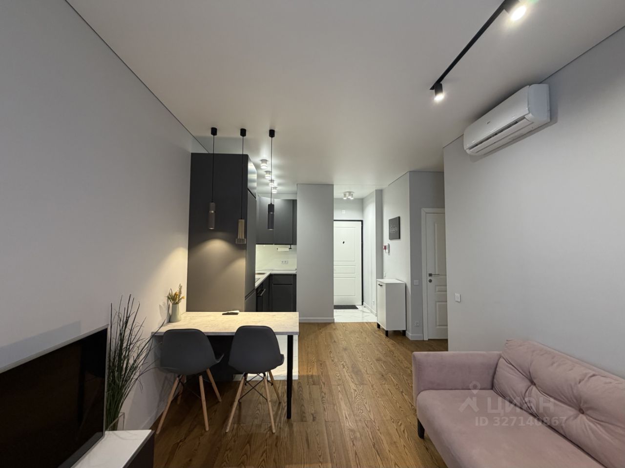 Планировка: кухня-гостиная с обеденной зоной с телевизором и удобным диваном, мастер-спальня с большим встроенным шкафом с хорошим наполнением, совмещенный санузел с ванной, также большой шкаф в прихожей.