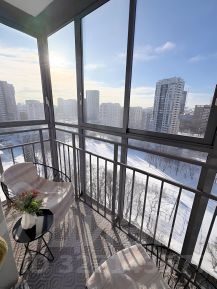 Большая лоджия с панорамным остеклением , зона отдыха с креслами, а так же металлический стеллаж для хранения.