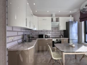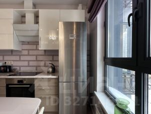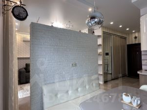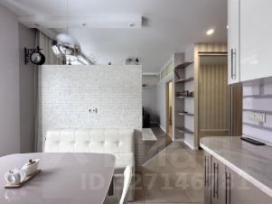 Кухня-гостиная разделена декоративной перегородкой, в зоне кухни гарнитур со всей техникой и посудой, обеденная группа с диваном и стульями. По технике: холодильник большой, двухкамерный, посудомоечная машина, рожковая кофемашина, тостер, СВЧ, индукционная плита и духовой шкаф.