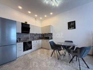 Квартира оформлена с дизайнерским ремонтом и полностью готова к комфортному проживанию. Просторная кухня площадью 20 кв. м оснащена всей необходимой мебелью и современной техникой: есть холодильник, посудомоечная машина и кондиционер. В комнате также есть мебель, а в ванной — ванна. Совмещенный санузел обеспечивает удобство и функциональность.
