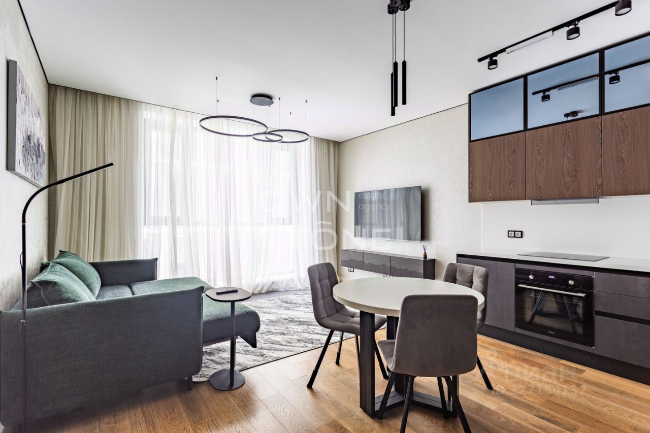 Планировка: просторная кухня-гостиная, мастер-спальня, кабинет (может использоваться как вторая спальня), санузел с душевой кабиной, теплые полы по всей квартире. Окна во двор. Мебель докупается под запрос арендатора. В квартире очень тихо.