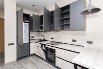 В кухне-гостиной установлен кухонный гарнитур с огромным количеством пространств для хранения, с холодильником, посудомоечной машиной и мини барной стойкой, столиком со стульями и большим раскладным ортопедическим диваном, телевизором, кондиционером.