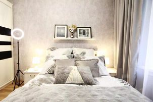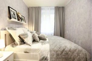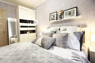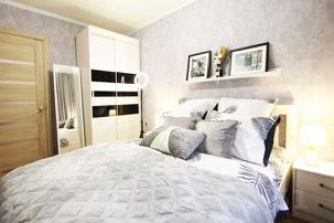 Комнаты изолированные. Одна комната в серых тонах небольшая по размеру, там находится только кровать, шкаф, тумбочки. Вторая комната достаточно просторная.