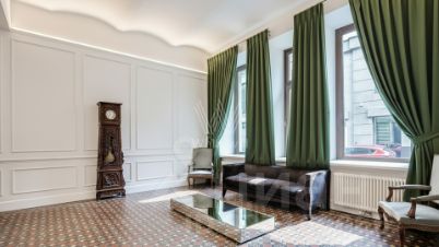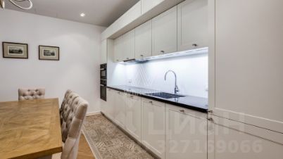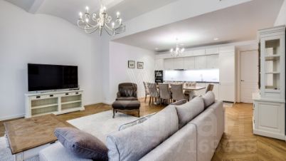 Планировка: гостиная с зоной кухни-столовой, 2 спальни со своими гардеробными и ванными комнатами, гостевой санузел, холл. Апартамент полностью с мягкой мебелью, кухня оборудована встроенной техникой Miele. Окна ориентированы на 2 стороны света — в Черкасский переулок и во внутренний двор.