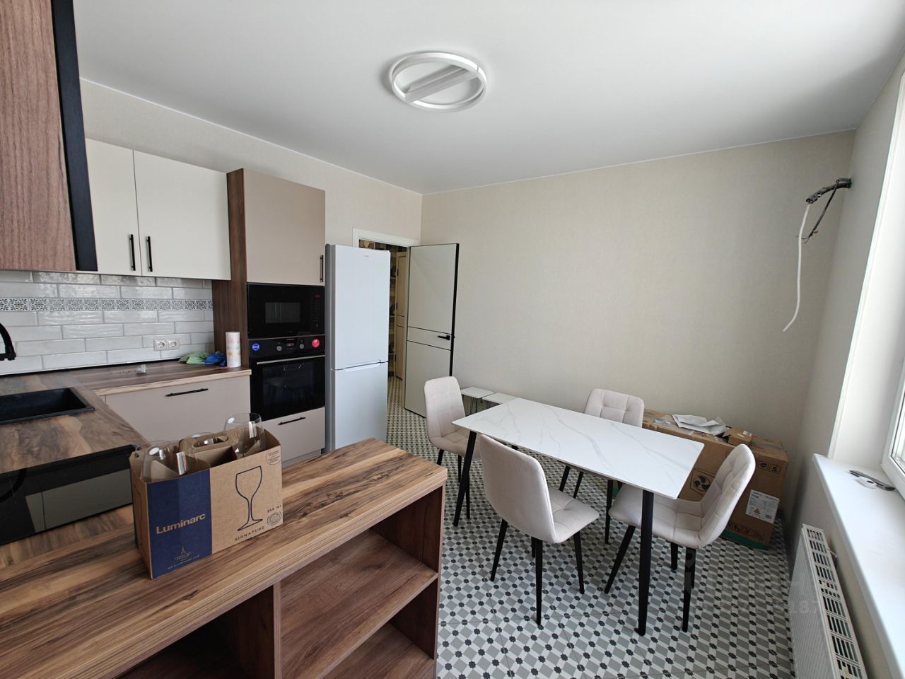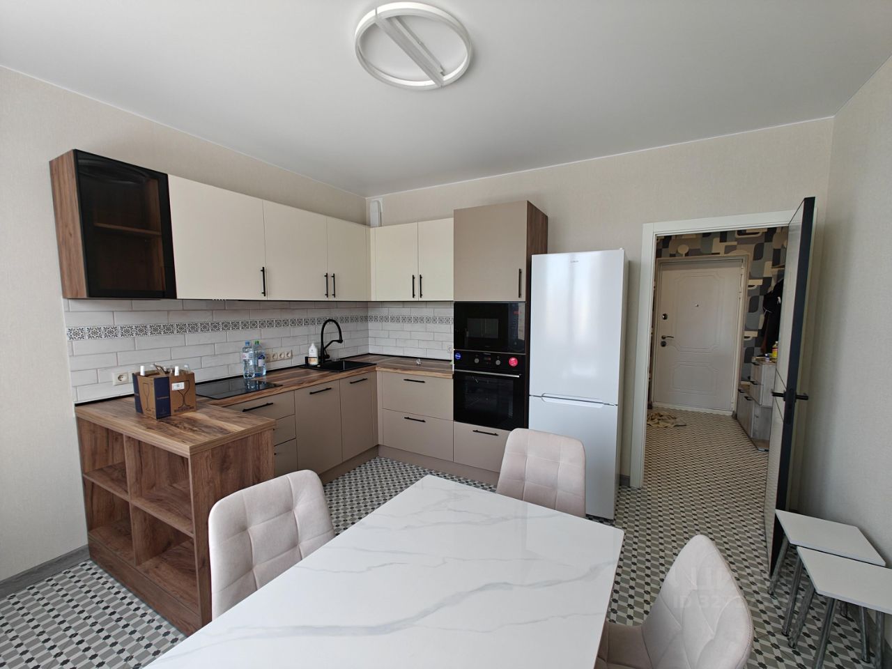 На кухне: стол, стулья, духовка, микроволновка, посудомойка, вытяжка, холодильник, полы - плитка.