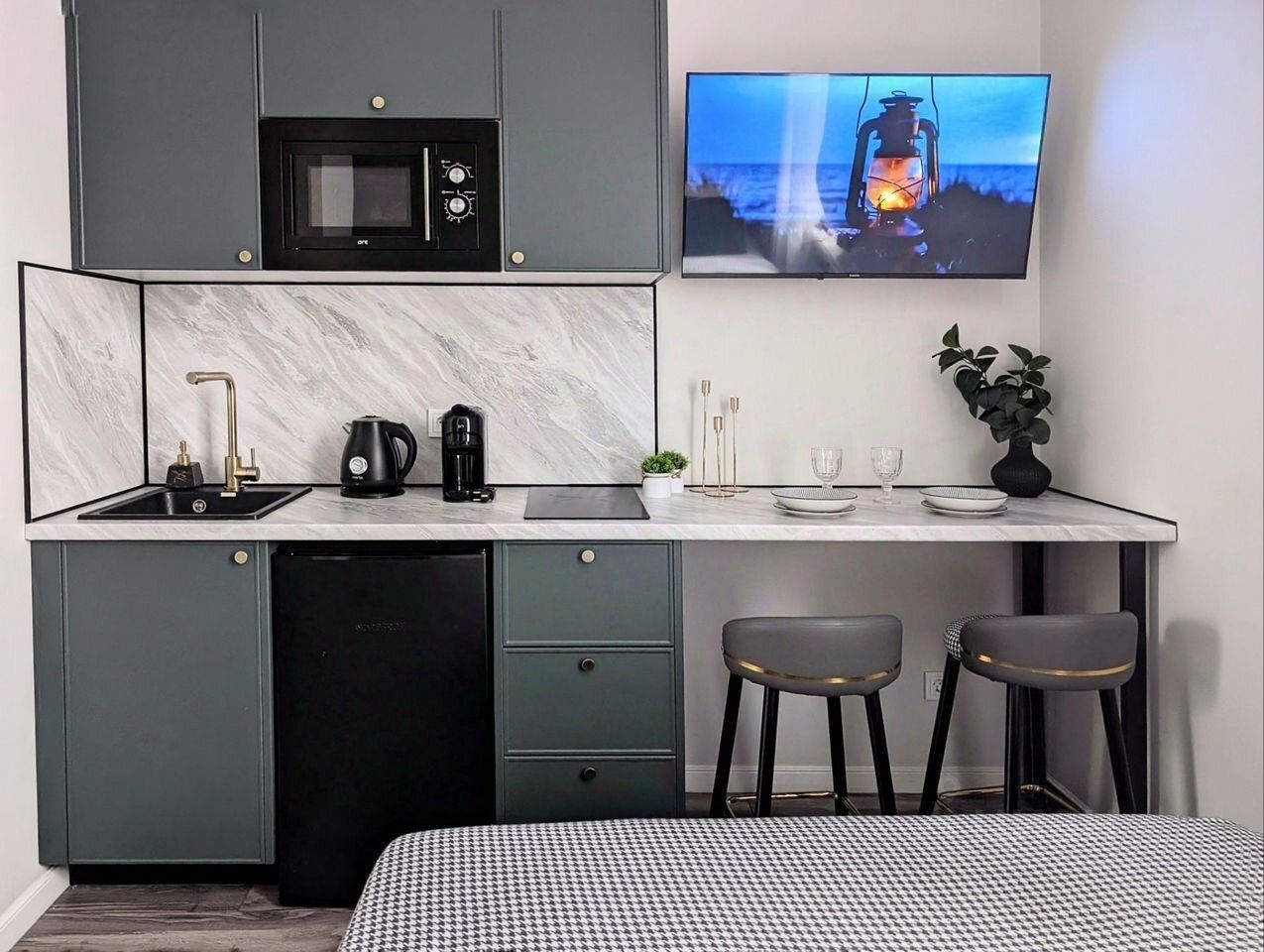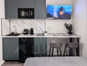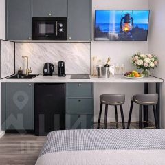 * мини-кухня со всем необходимым для приготовления пищи: холодильник, плита, СВЧ, чайник, кофемашина а так же набор посуды и кухонных приборов.