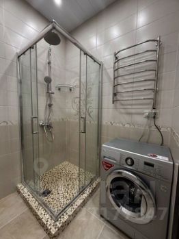 Ванная комната: сантехника, стиральная машина, электрический полотенцесушитель, мебель, вытяжка.