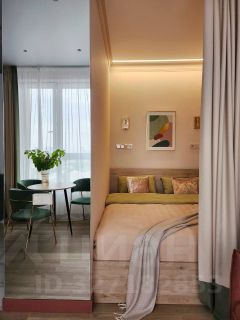 Светлая студия площадью 35 м² с современной отделкой в нейтральных тонах. Грамотное зонирование разделяет пространство на полноценную спальную зону, гостиную и кухню, а благодаря высоким потолкам здесь не чувствуешь себя в тесной однушке, а наслаждаешься свободой и воздухом.