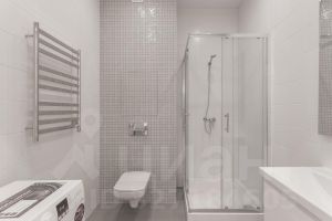 Санузел с душевой кабиной и стиральной машиной.