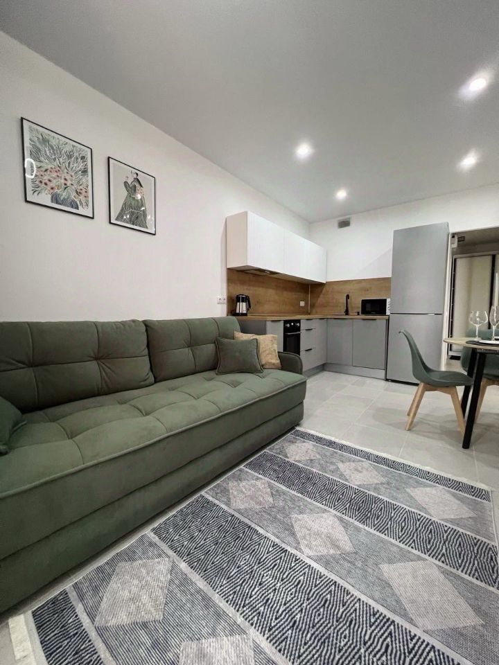 Квартира полностью меблирована: на кухне и в комнате есть вся необходимая мебель, а также современная техника — кондиционер, холодильник, посудомоечная и стиральная машины, телевизор. Ванная комната оборудована ванной. Интерьер выполнен в светлых и приятных тонах, что создаёт атмосферу уюта и спокойствия. Скоростной интернет позволит оставаться на связи и работать из дома без перебоев.