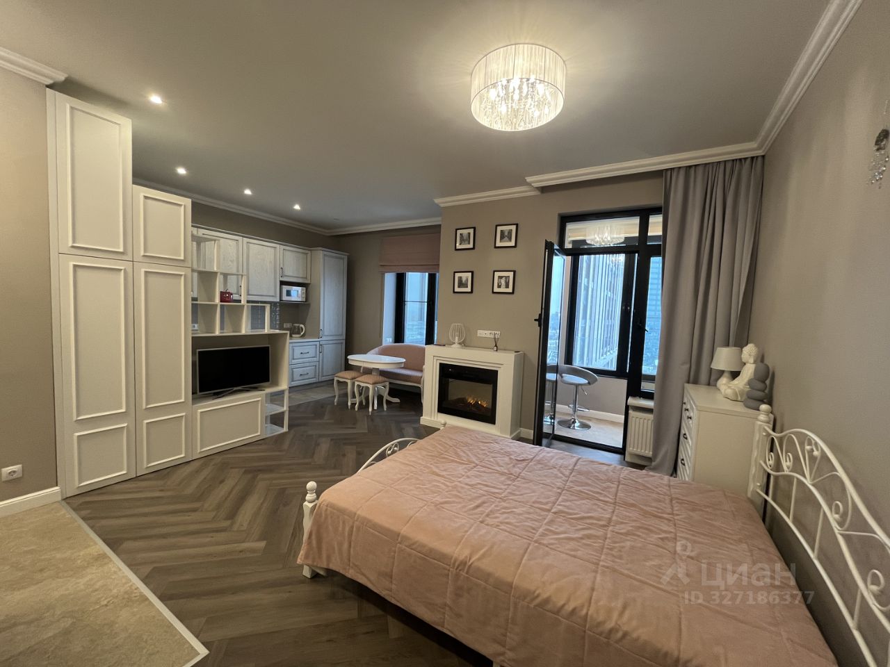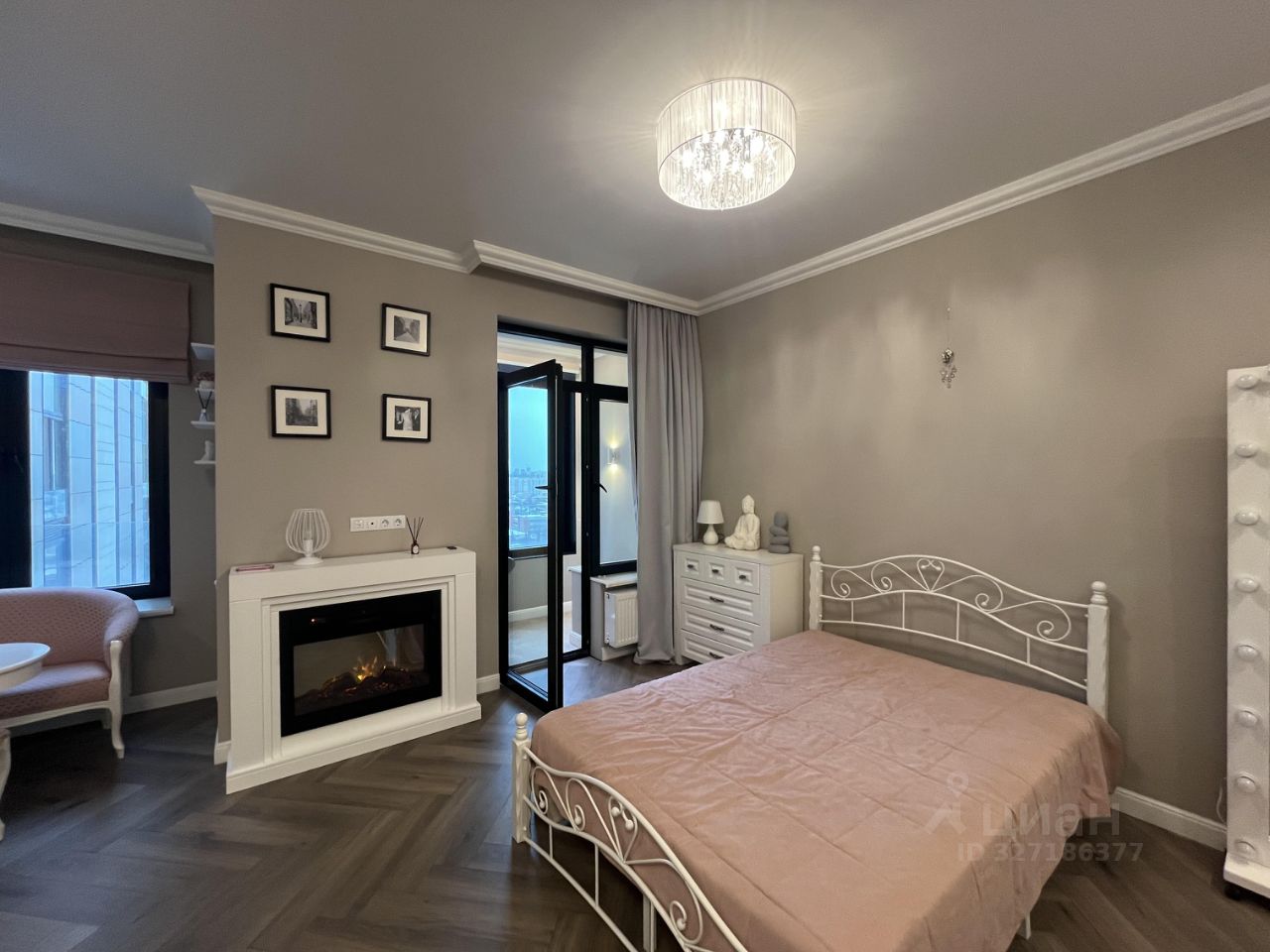 Комната с электрическим камином создает дополнительный уют, а выход на застекленную лоджию, откуда открывается потрясающий вид, создает дополнительную атмосферу уюта, установлен кондиционер.