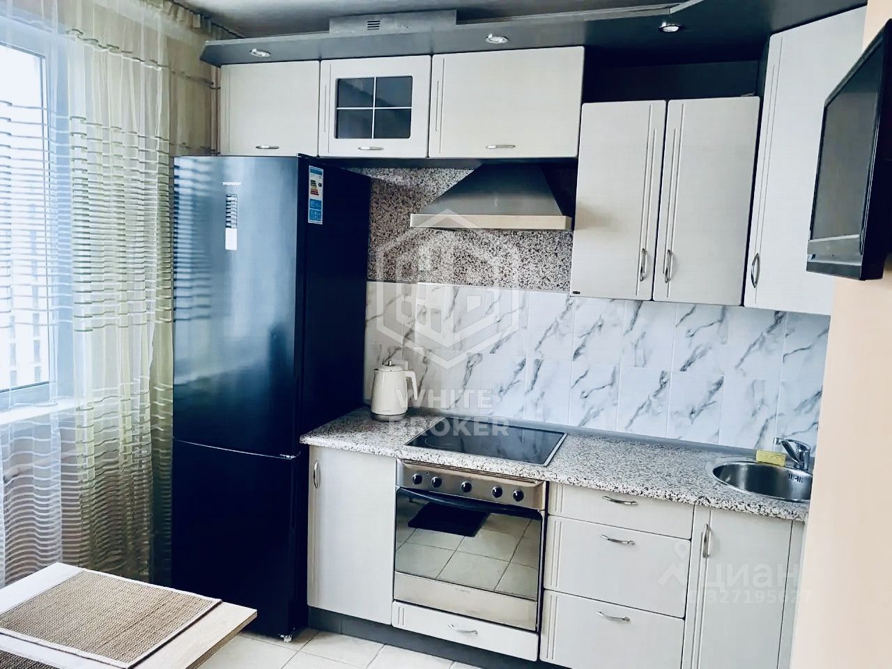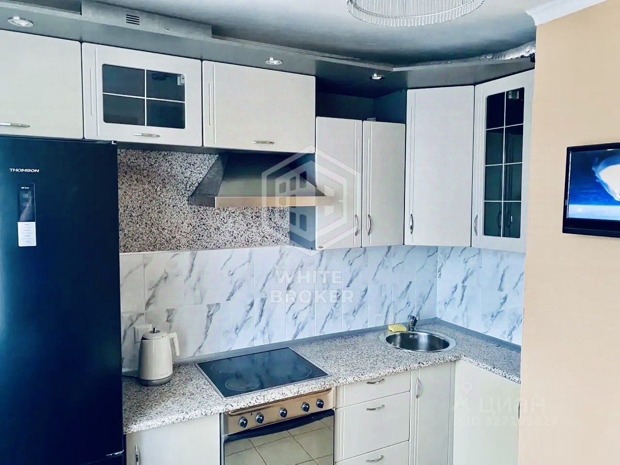 Кухня: современный гарнитур, холодильник Thomson, сенсорная электрическая плита с духовым шкафом, вытяжка, электрический чайник, телевизор, раскладной диван (2 спальных места), стол и стулья.