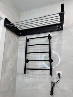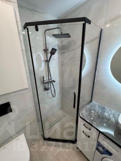 Уютная ванная комната оборудована подвесным унитазом, душевой кабиной с тропическим душем, стиральной машиной под столиком с раковиной, электрическим полотенцесушителем,