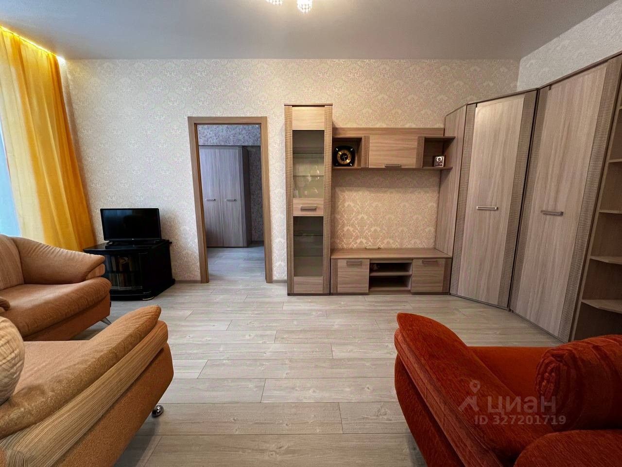 Для проживания все необходимое есть. В большой комнате 2 дивана, мебельная стенка, тумба под телевизор и телевизор. В маленькой комнате двуспальная кровать, шкаф для одежды, торшер, туалетный столик. На кухне гарнитур под общую столешницу, холодильник, стол , стулья, свч-печь, чайник. В прихожей стиральная машина автомат.