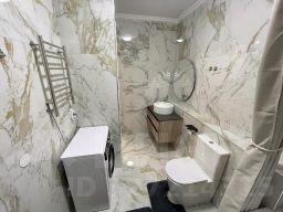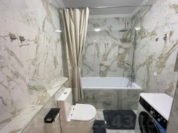 С/У совмещен. Отделка итальянской плиткой до потолка. Установлена качественная немецкая сантехника .Новая стиральная машина автомат .