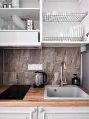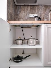 - Кухня с холодильником, плитой, микроволновкой, чайником и посудой