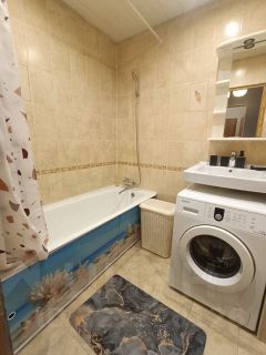 Просторная светлая квартира с отдельной спальней и рабочим кабинетом. Большая кухня с выходом на застекленную лоджию оснащена необходимой техникой и мебелью. Санузел совмещенный, установлена стиральная машина. В квартире есть необходимая мебель: двуспальная кровать, шкафы, письменный стол, прихожая, в коридоре встроенный шкаф.